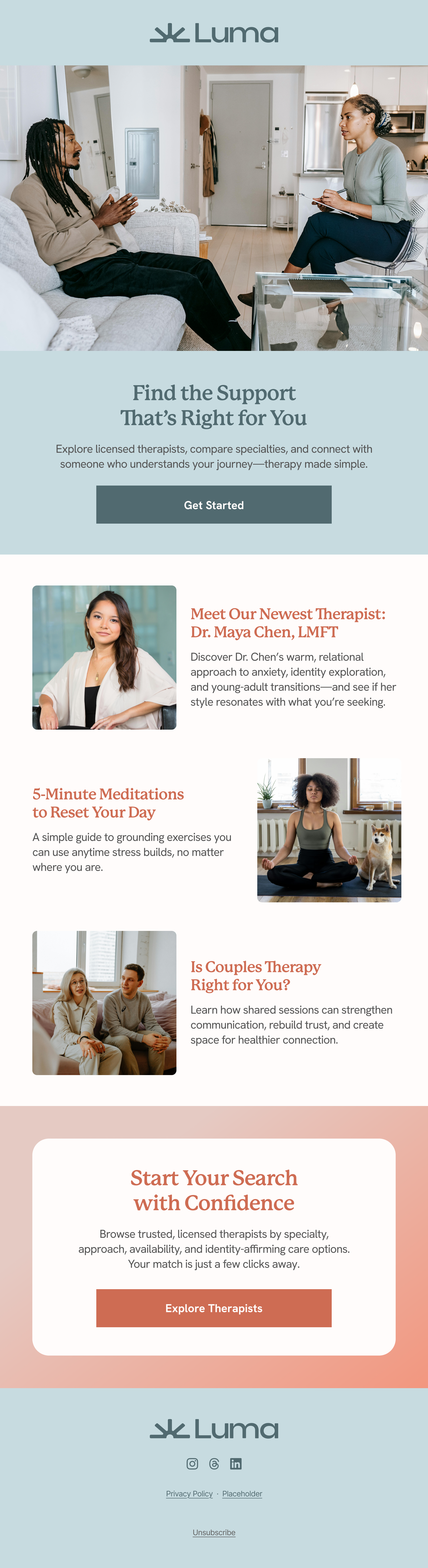 The visual identity embodies trust, approachability, and expertise through a slab serif typeface that conveys stability and professionalism while remaining welcoming. A warm color palette—soft oranges, muted pinks, and gentle neutrals—evokes comfort, optimism, and a sense of safety. Photography highlights a diverse patient base, emphasizing inclusivity, real-world connection, and the positive impact of therapy. Together, these elements form a cohesive brand system that reassures users, reflects Luma’s mission, and positions the platform as both caring and credible.