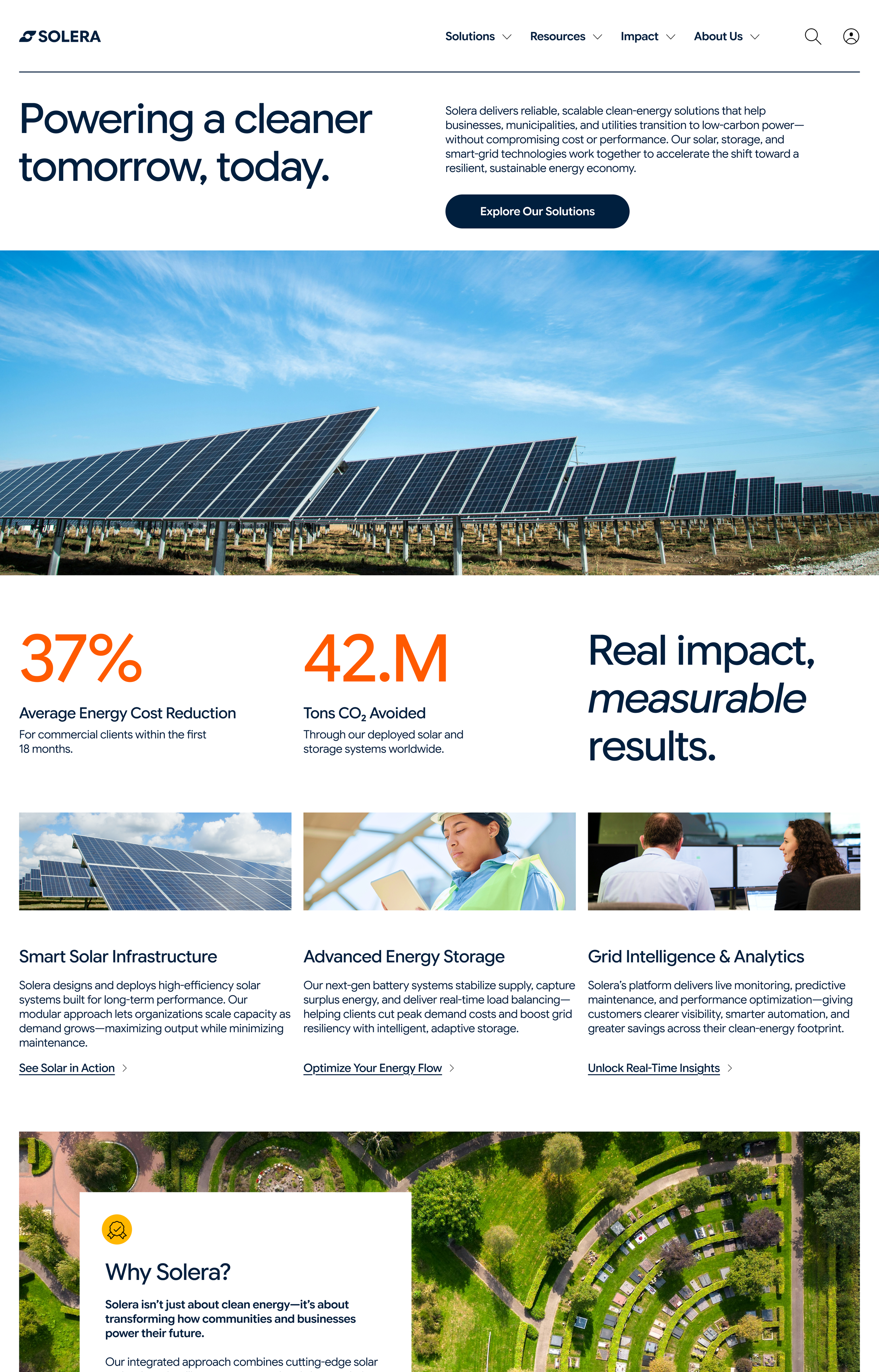 Solera’s impact and expertise are communicated through a clean, minimal interface that prioritizes clarity and visual hierarchy. Generous negative space allows key metrics and insights to stand out, making complex energy data instantly digestible. Modern sans-serif typography conveys professionalism and approachability, while a contemporary color palette with subtle accent colors highlights critical statistics and interactive elements, guiding users through the story of Solera’s clean-energy solutions. The design emphasizes essential content, data-first visuals, and intuitive navigation, creating a visually engaging, modern, and highly readable experience.